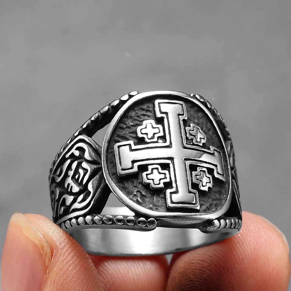 Anel Cruz de Jerusalém de Aço Inoxidável