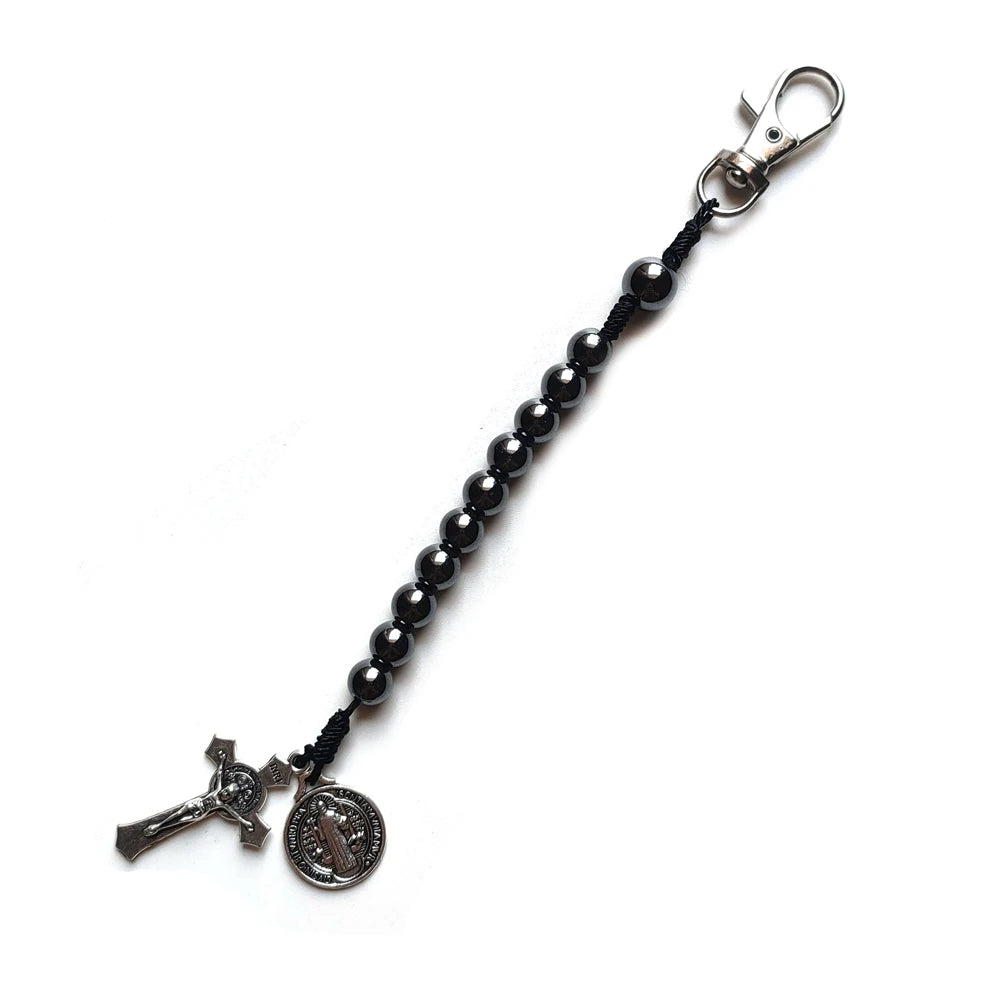 Chaveiro Dezena de Hematita com Cruz e Medalha de São Bento