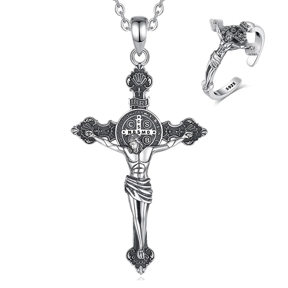 Conjunto Anel e Colar Cruz de São Bento em Prata 925