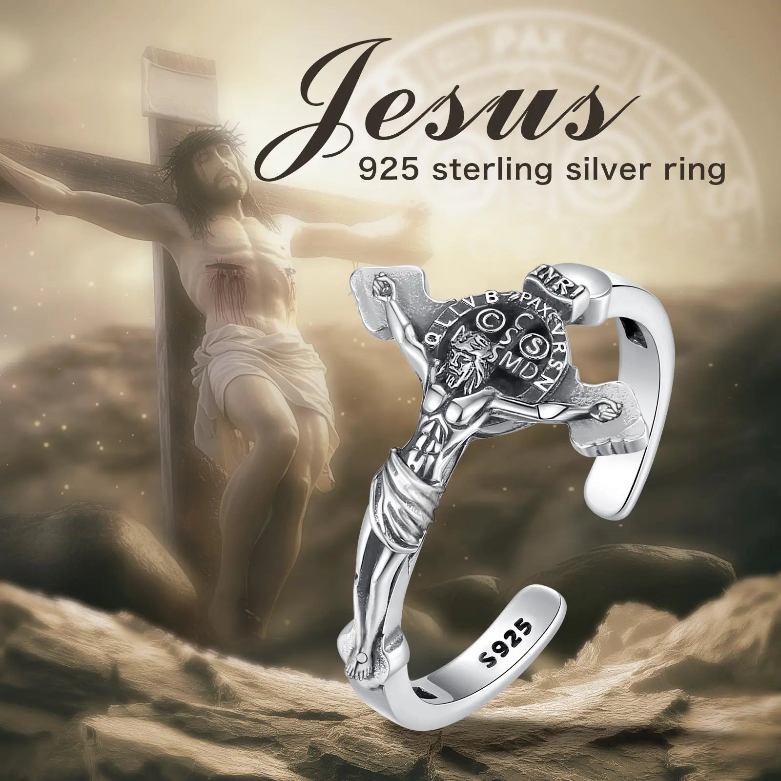 Cada peça é feita em prata esterlina 925, material nobre, hipoalergênico e durável. O colar traz a Cruz de São Bento em acabamento polido e detalhado, enquanto o anel ajustável oferece conforto e versatilidade para diferentes tamanhos.