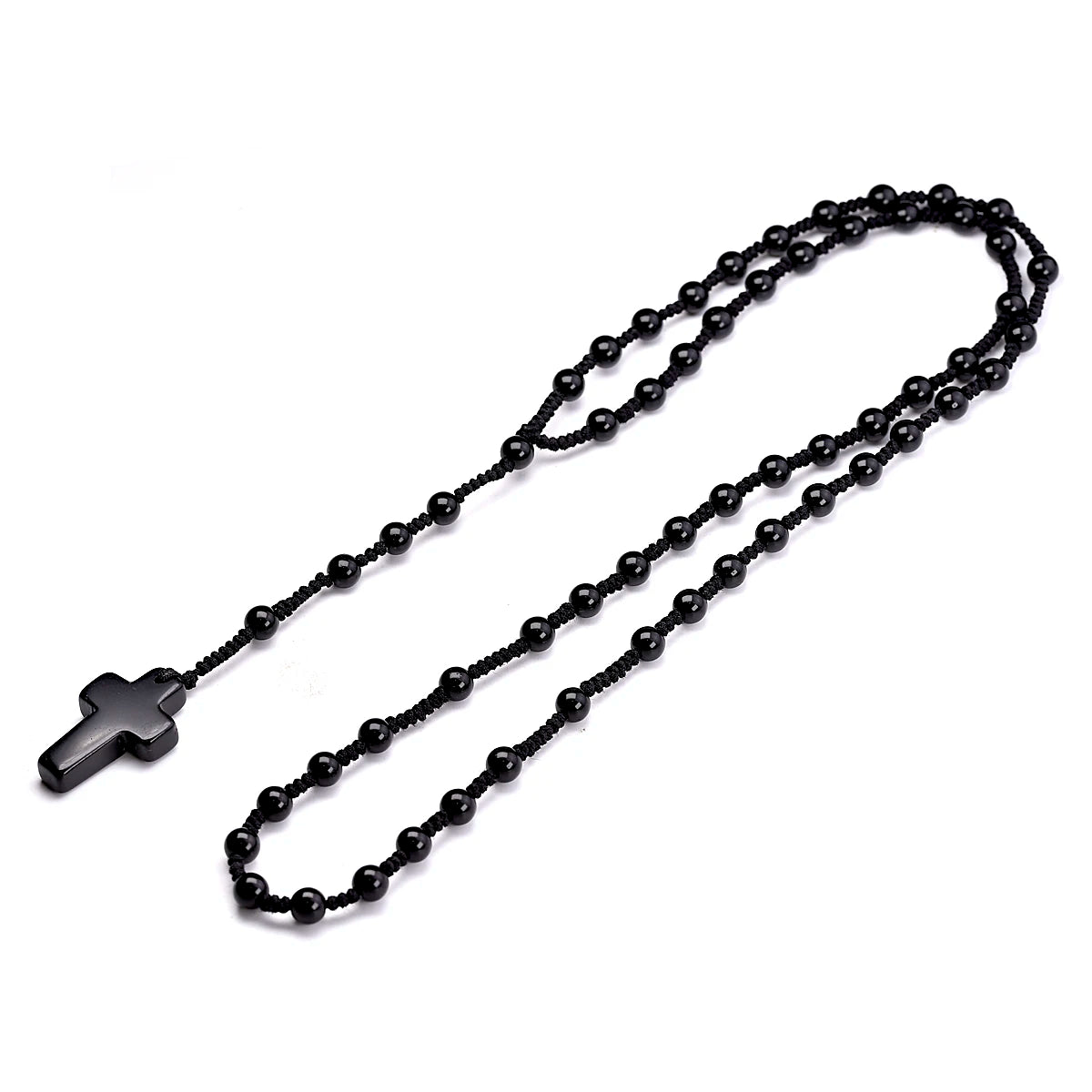 Conjunto Terço e Pulseira de Ágata Negra com Pingente de Cruz