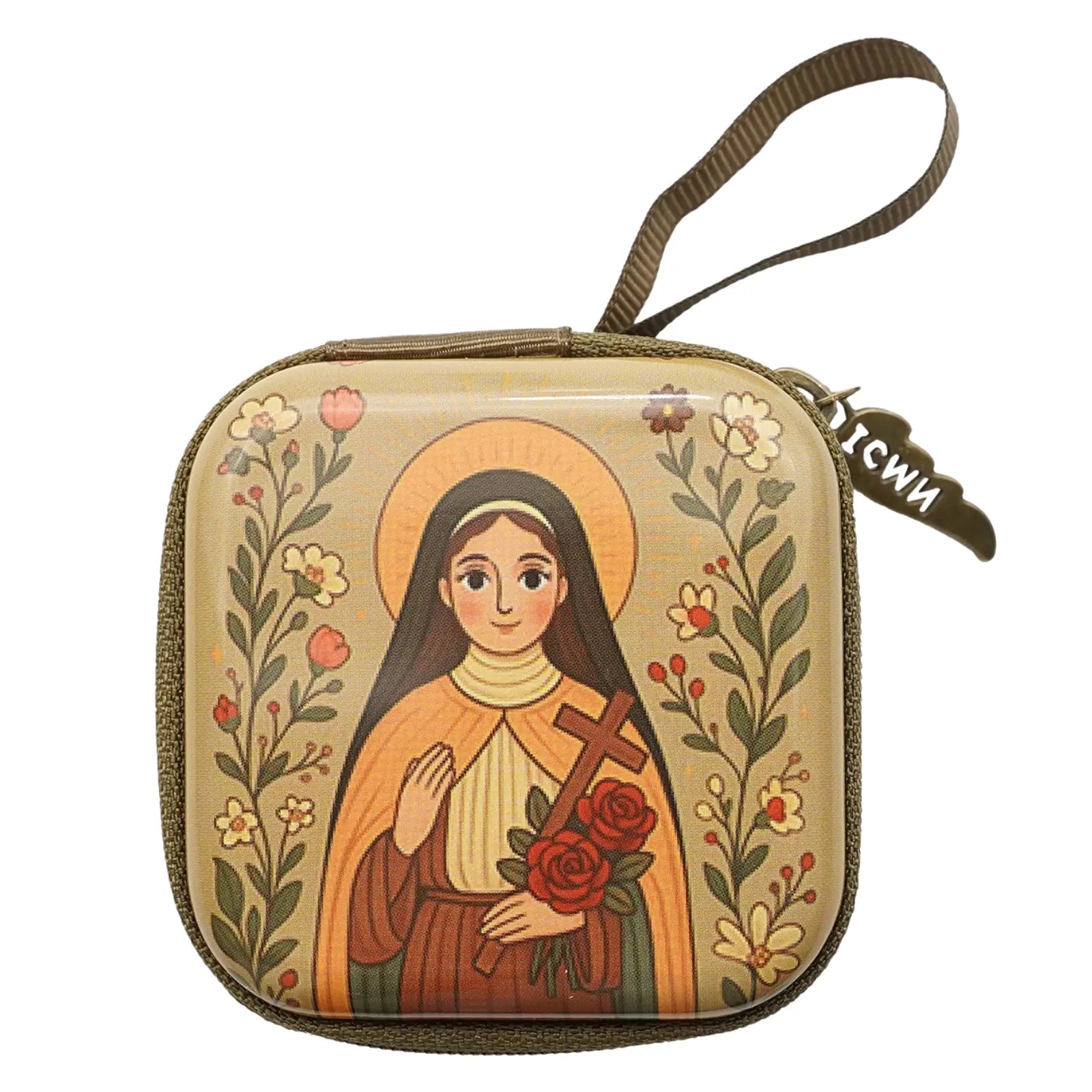 Com design compacto e resistente, ele protege seu terço em casa, nas viagens ou no bolso, e traz a delicada imagem em estilo cartoon de Santa Teresinha como lembrança do caminho da confiança e do amor.