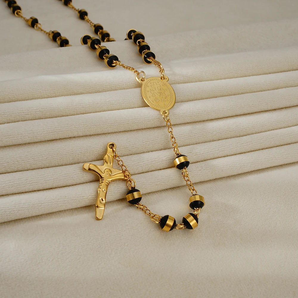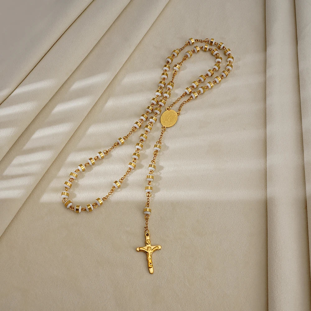 Produzido em aço inoxidável com banho de ouro 18k, une durabilidade e elegância, tornando-se ideal tanto para a oração diária quanto para ocasiões especiais de fé.