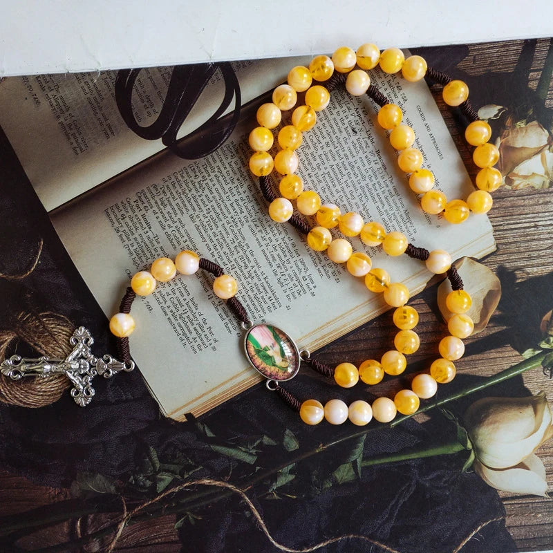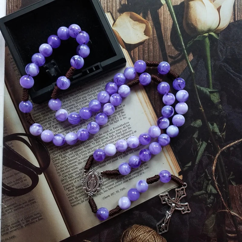Com crucifixo prateado de 3,3 x 5,8 cm, corda resistente e contas de acrílico, este terço une beleza, praticidade e espiritualidade.