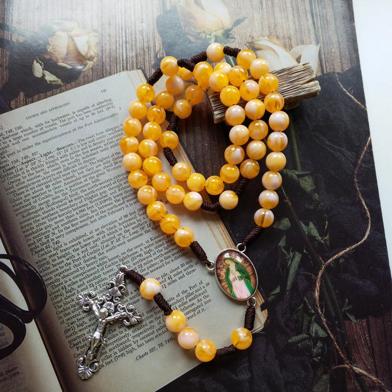 No entremeio, você pode escolher entre a imagem de Nossa Senhora de Guadalupe (na versão com contas laranja) ou Nossa Senhora das Graças (nas versões azul ou roxa). Ambas recordam a ternura e a intercessão da Mãe Santíssima, que nos conduz sempre a Jesus.
