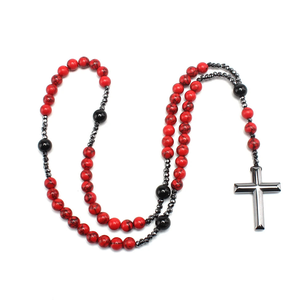 Terço com Contas Turquesa Vermelha e Cruz de Hematita