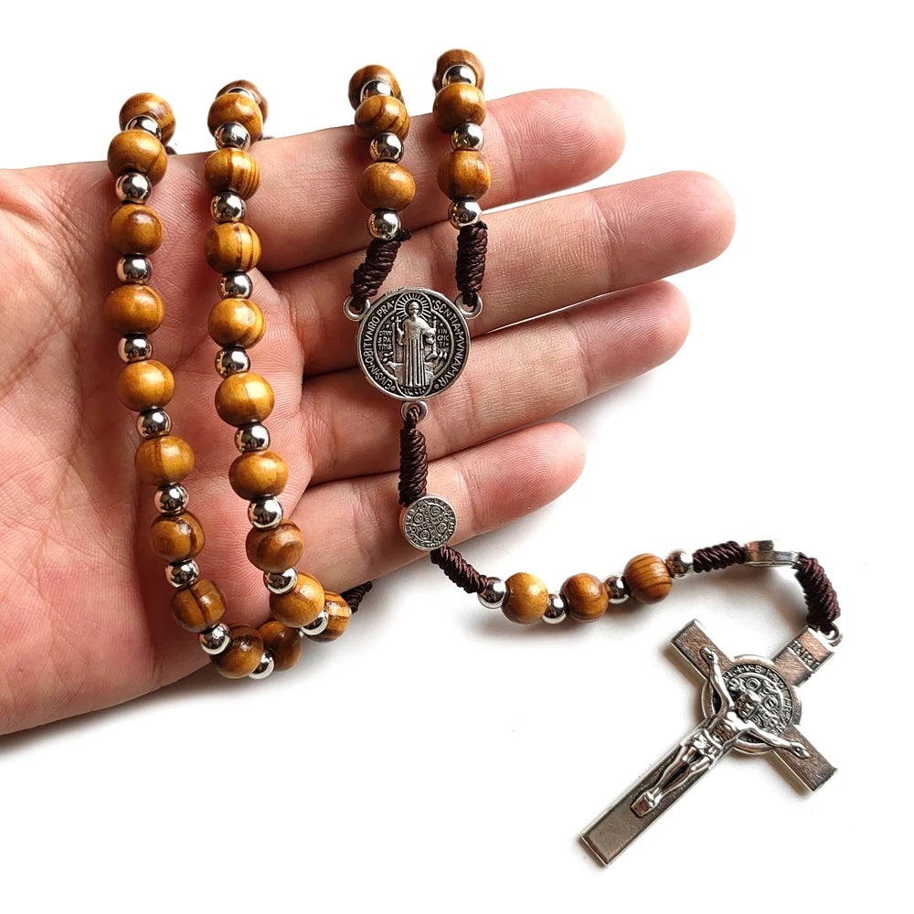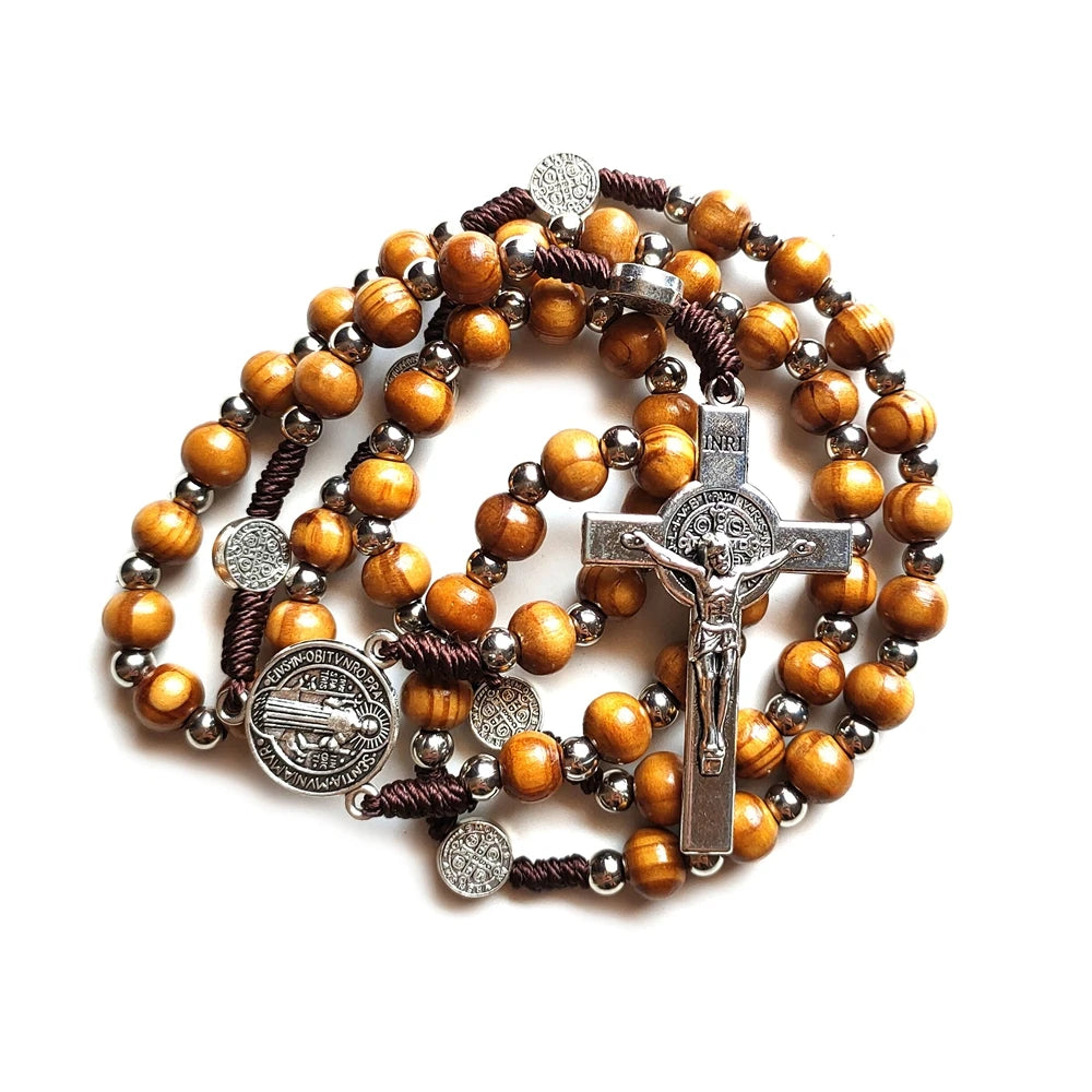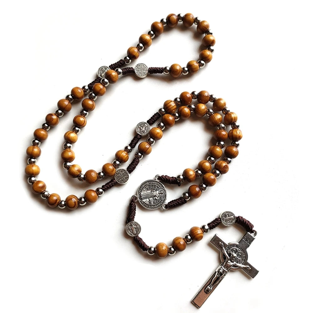 Terço com Medalha e Cruz de São Bento com Contas de Madeira