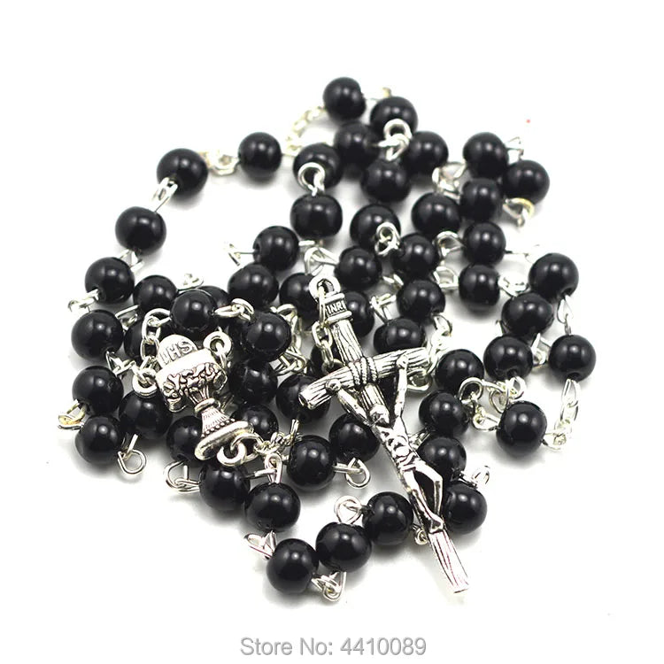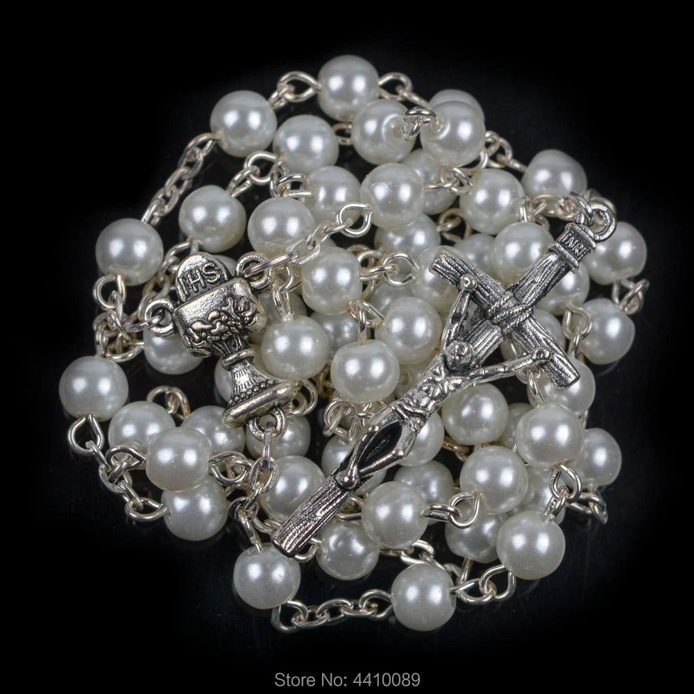 Com entremeio representando a hóstia e o cálice, este terço recorda, a cada oração, a entrega total de Cristo na Eucaristia. O crucifixo prateado (44 x 17 mm) completa a peça, unindo o sacrifício da Cruz ao Sacramento do Altar.