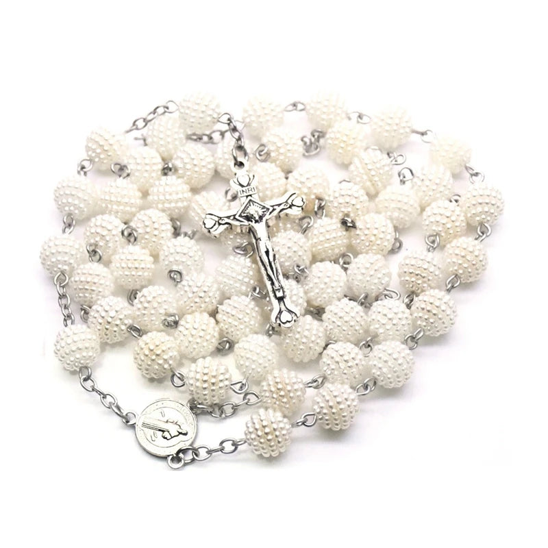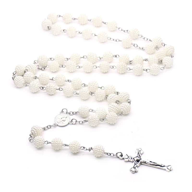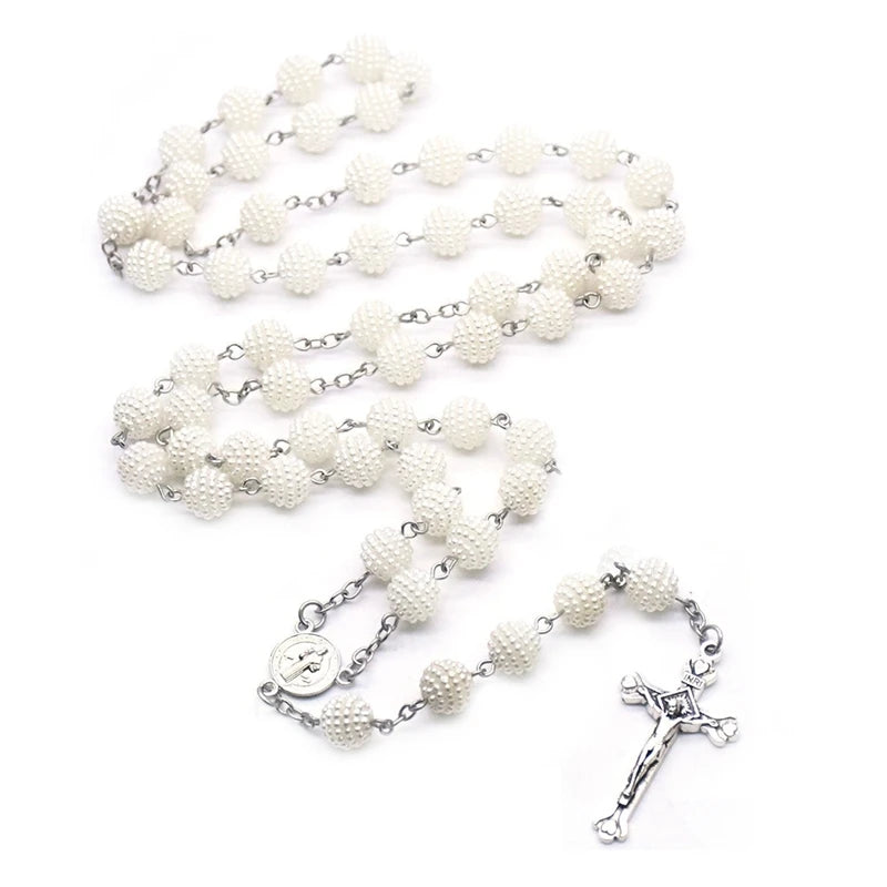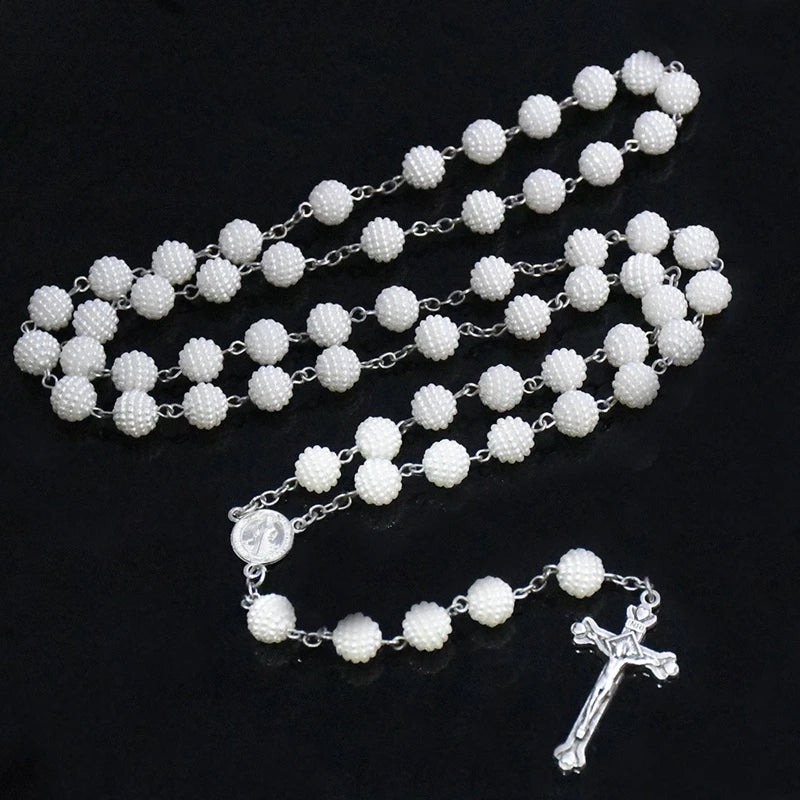 - Contas brancas de 10 mm: símbolo de pureza e fé.