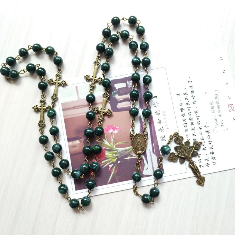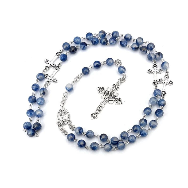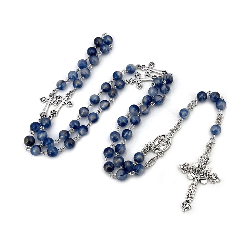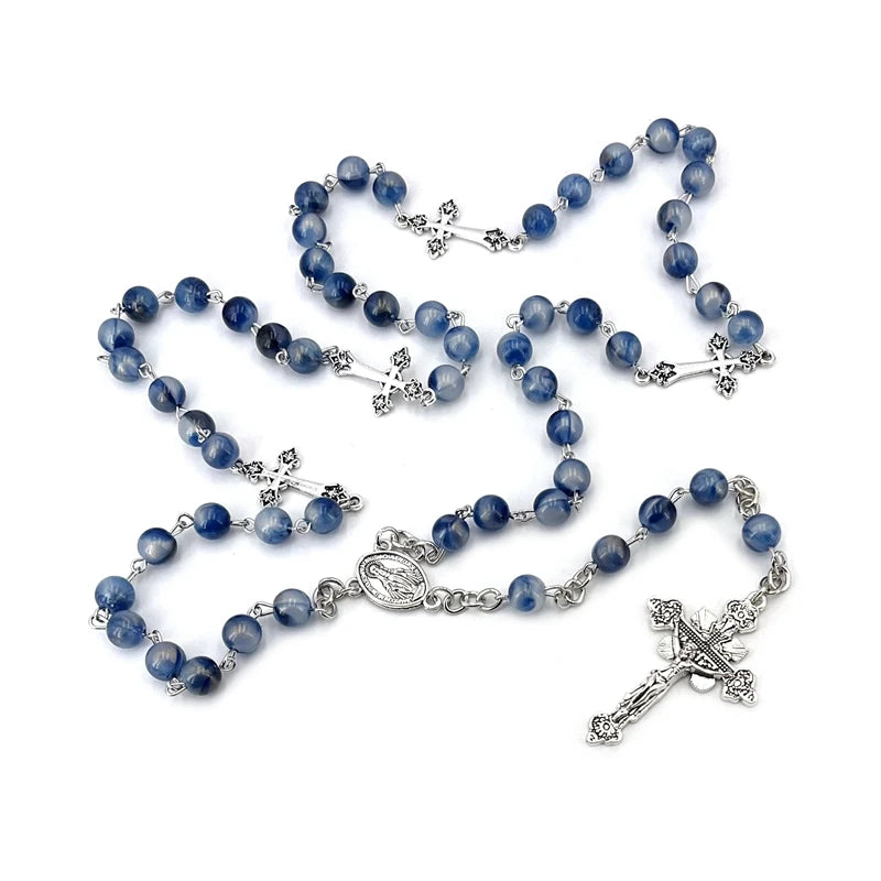 Com entremeio da medalha e contas em acrílico de 8 mm, disponíveis nas cores verde ou azul, este terço combina leveza e resistência para acompanhar sua oração diária.