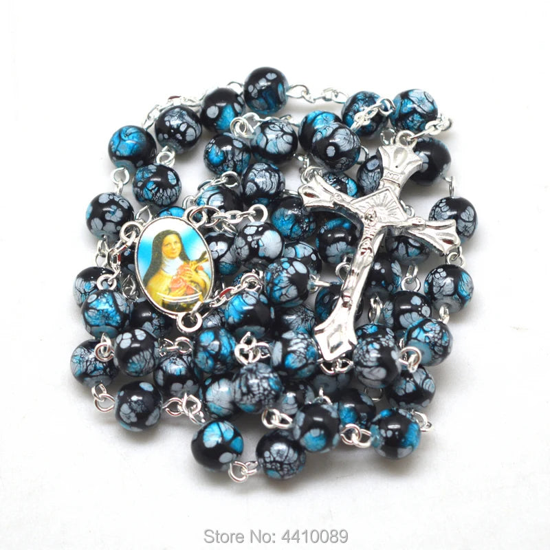 Terço de Santa Teresinha do Menino Jesus com Contas de Vidro Azul e Preto