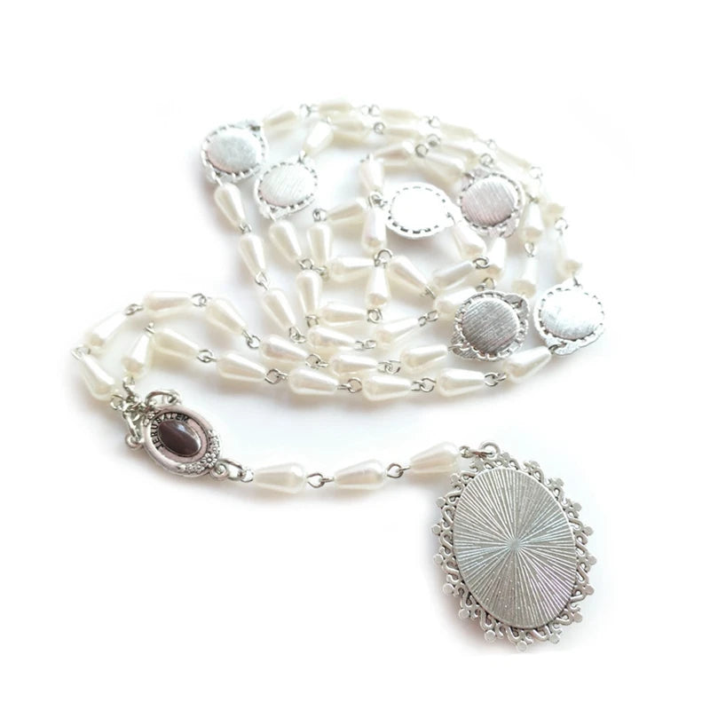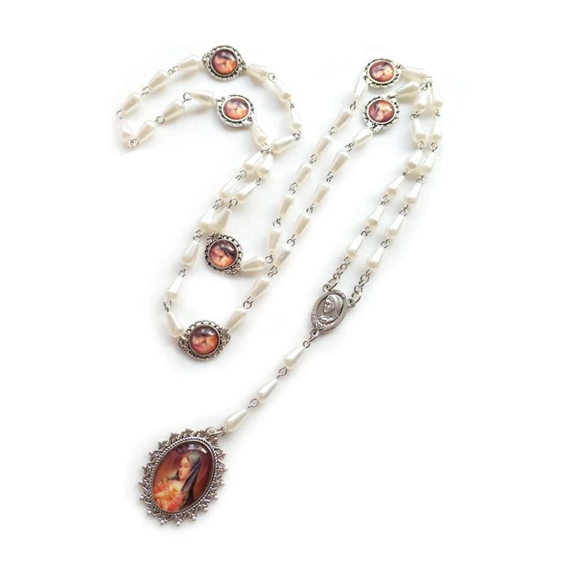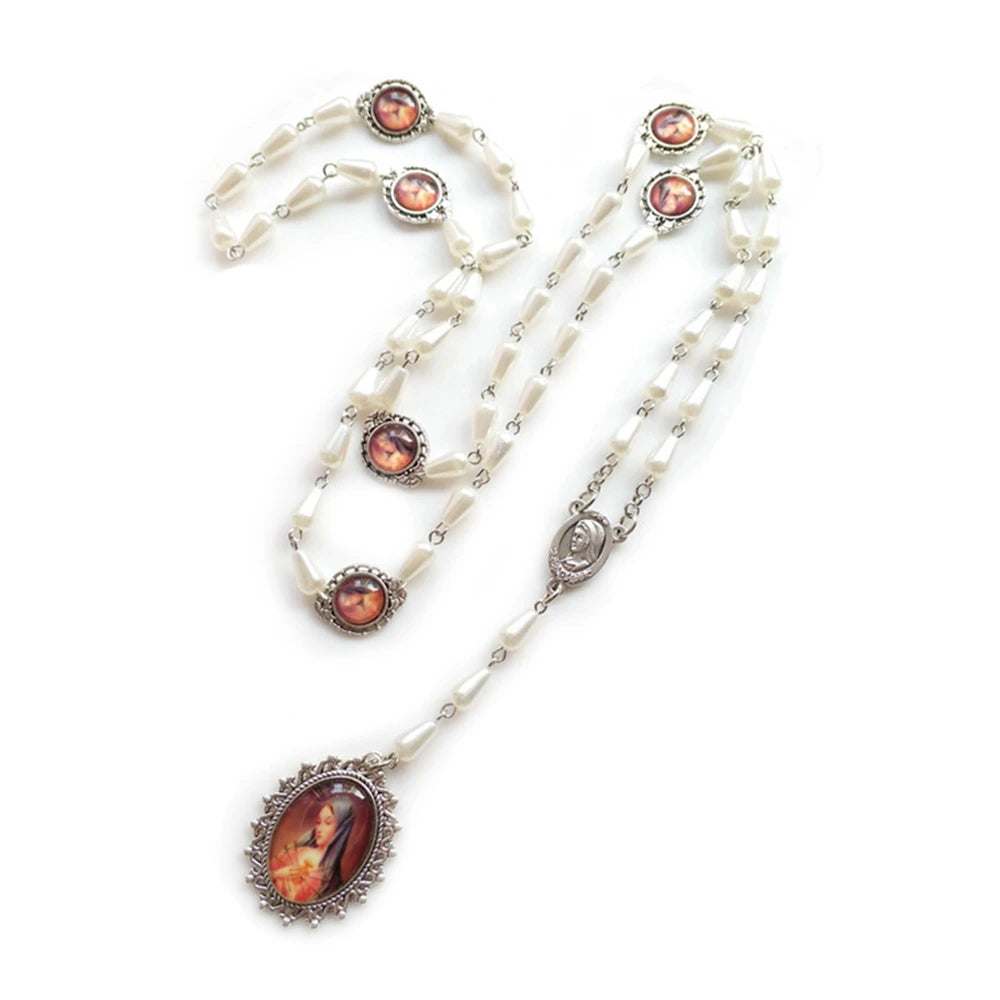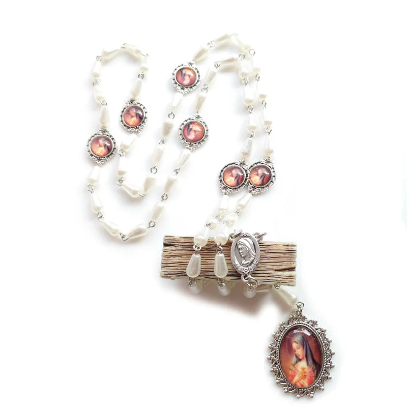 As contas em pérola de vidro e o pingente com a imagem do Imaculado Coração tornam este terço não apenas belo, mas um companheiro espiritual diário para quem deseja caminhar mais perto de Jesus pelas mãos de sua Mãe.